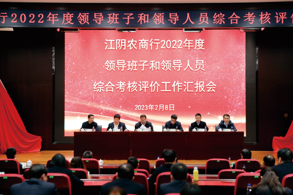 2月8日,江阴农商银行召开2022年度领导班子和领导人员综合考核评价工作汇报会。省联社党委副书记、第三考核组组长景伯秋,党群工作部总经理骆新超,办公室副主任周如田;无锡银保监分局朱立新;江阴市委组织部陆嘉峰以及省联社第三考核组其他成员出席会议。我行领导班子成员、部分董监事、部门负责人、支行行长及职工代表参加会议。会议由我行党委书记、董事长孙伟主持。